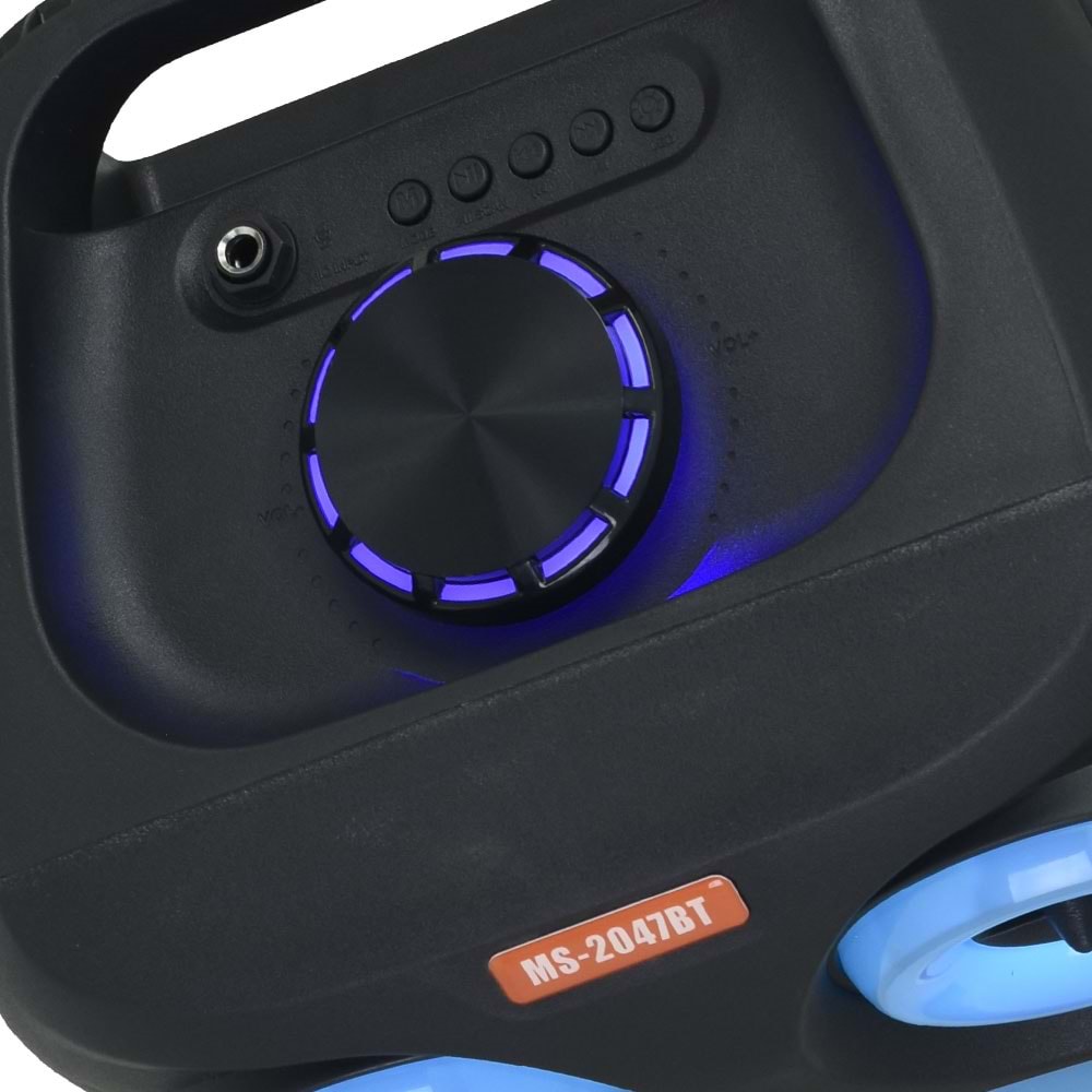 Pour créer une atmosphère, ce haut‑parleur peut proposer (selon version) un éclairage LED ou des effets visuels qui ajoutent du style à vos écoutes festives. Les boutons de contrôle sont simples, et parfois une télécommande est fournie — ce qui facilite les ajustements sans se lever.